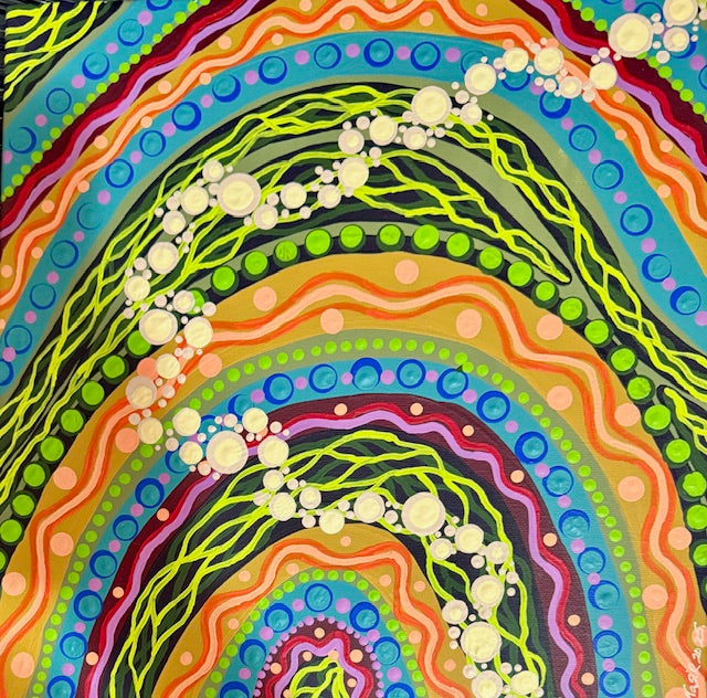 From sunrise to moonlight, the land is painted in endless hues—gold, crimson, violet, and deep indigo. Wind, rain, sun, and mist weave their layers across the canvas of Country, each moment alive with shifting beauty. The cream dots of the Stone Dreaming flow through it all, holding strength, spirituality, and resilience, embracing every colour that belongs to our Country.